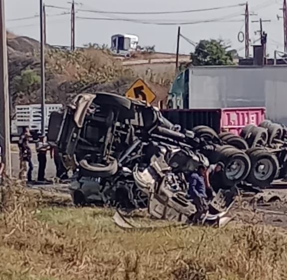 Un tráiler volcó y cayó sobre una camioneta compacta en la carretera federal 1110, a la altura de las instalaciones de la Comisión Federal de Electricidad, dejando al conductor atrapado pero con vida.