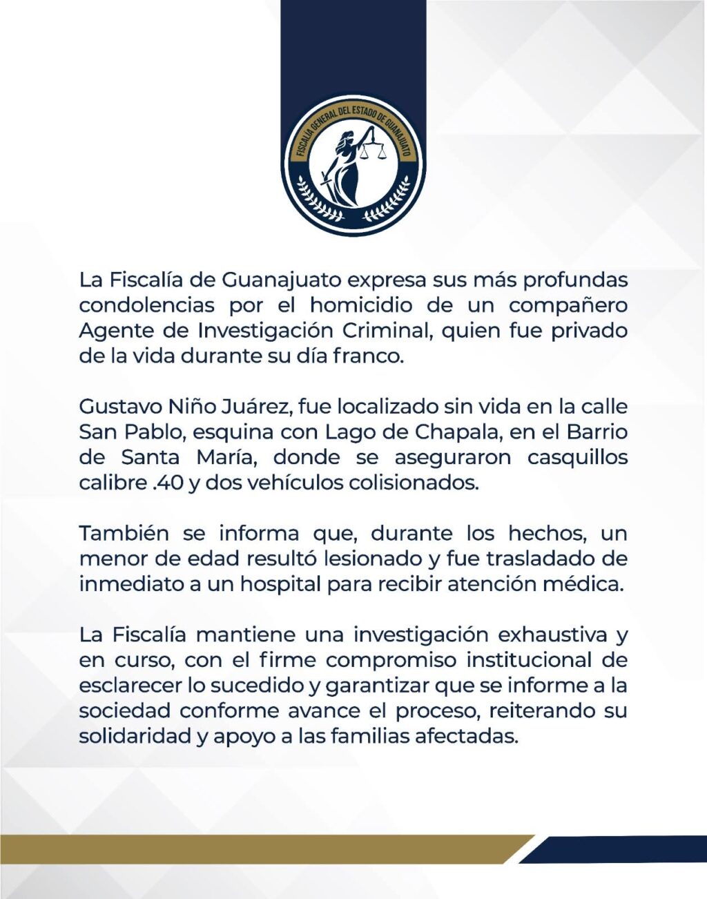 Yuriria, Gto. — La Fiscalía General del Estado de Guanajuato (FGE) emitió un comunicado oficial para expresar sus condolencias y confirmar el homicidio de uno de sus elementos, un Agente de Investigación Criminal (AIC), mientras se encontraba en su día franco en el municipio de Yuriria.